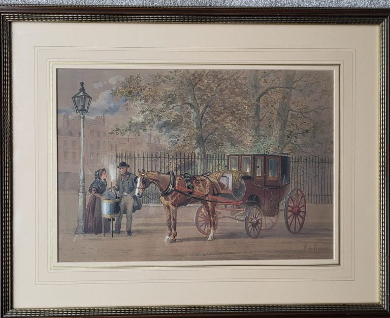 Framed watercolour of a Coach, Horse & Chestnut Seller, signed, size 64x50cm